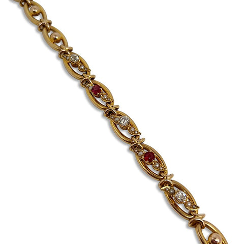 This exquisite 14kt yellow gold bracelet exemplifies the refined craftsmanship of the Belle Époque era. Featuring a stunning European design from circa 1900, it showcases old mine cut diamonds of exceptional character, complemented by deep crimson rubies and delicate seed pearls. The intricate setting demonstrates the meticulous artistry characteristic of fine jewellery from this period. A remarkable heirloom piece that captures the elegance and sophistication of turn-of-the-century design, perfect for collectors of authentic antique jewellery.