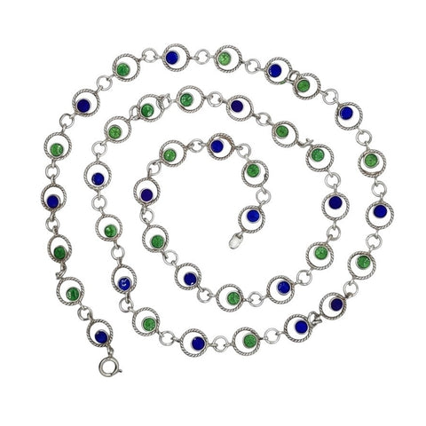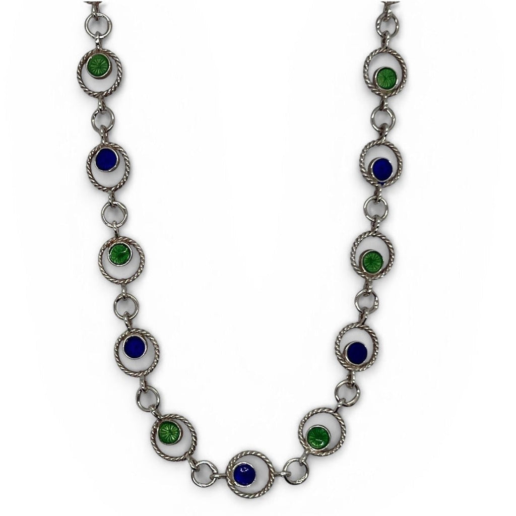 Step back in time with this delightful 1970s Italian necklace that's bursting with personality. Sterling silver twisted links dance around your neck, punctuated by cheerful alternating discs of blue and green enamel that catch the light with playful flair. It's the kind of vintage piece that sparks conversation and adds instant character to any outfit. Perfect for those who appreciate a splash of colour and genuine Italian craftsmanship with a fun, retro edge.