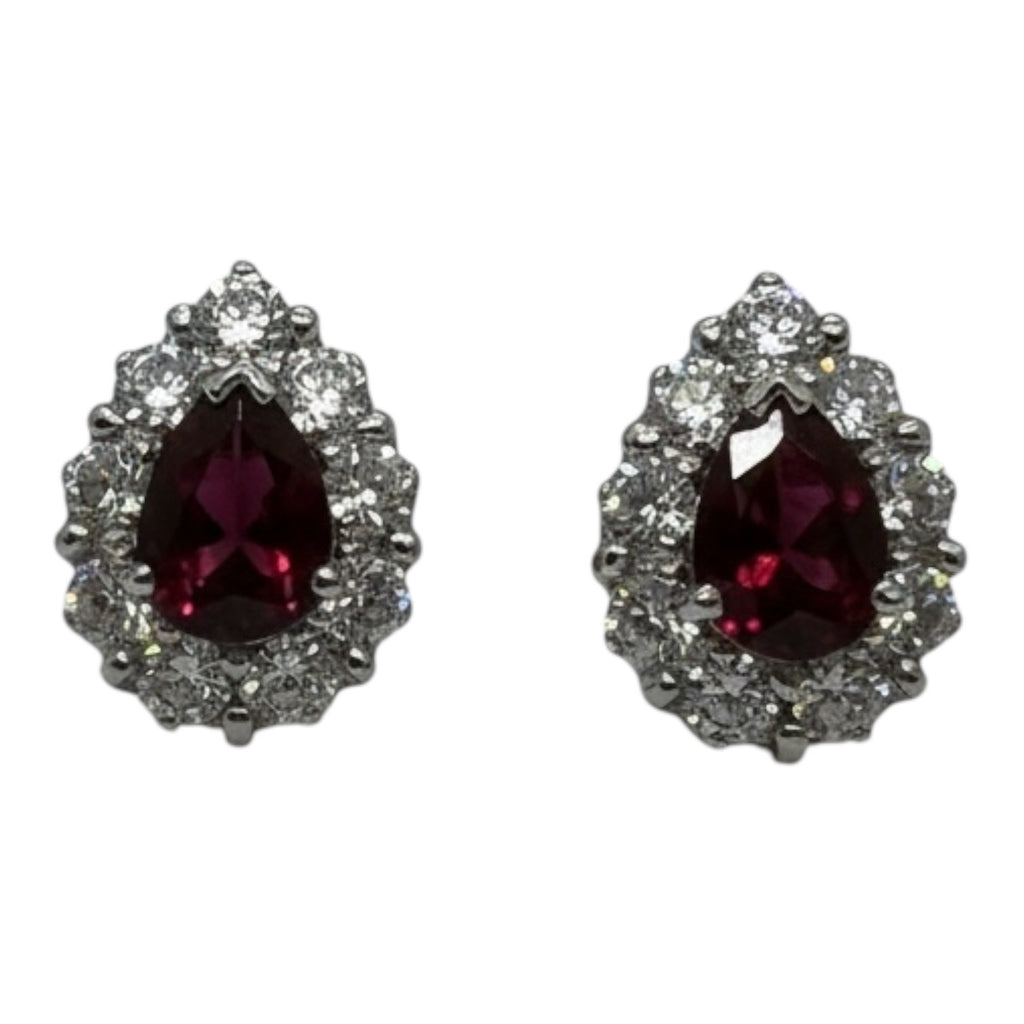 Discover timeless elegance with this pair of vintage ruby and diamond studs. Natural pear-shaped rubies take centre stage, each cradled by nine brilliant-cut diamonds that dance with light and sophistication. The 18 karat white gold setting provides a refined backdrop, allowing the deep crimson of the rubies to command attention whilst the diamonds add subtle radiance. Perfect for those who appreciate heritage jewellery with understated glamour, these studs transition effortlessly from day to evening wear.